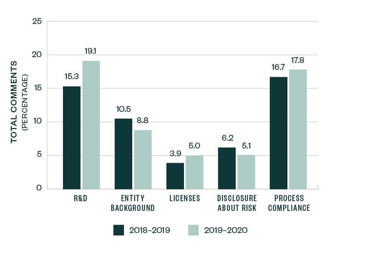 Throughout 2019–2020 report, R&D made up the largest area of SEC focus, with a strong emphasis on companies’ clinical trials. Comments related to process compliance and licensing agreements also saw a relative increase in focus, while those directed toward entity background and risk disclosures dipped slightly.