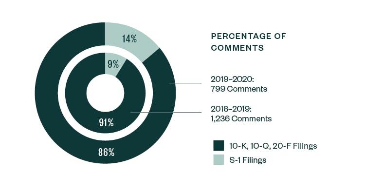 Similar to the 2018–2019 report, S-1 filings continued to lead in relation to SEC scrutiny. Of the total 799 comments analyzed in the study, 86% — or 684 comments — were directed at S-1 filings, slightly down from a share of 91% in 2018–2019. The remaining 14% of comments were directed toward Forms 10-K, 10-Q, and 20-F filings.