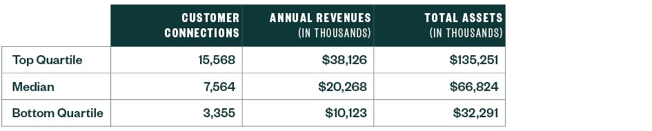 The graph below shows that the pandemic-driven broadband customer growth of 2020 and 2021 hasn’t perpetuated into 2022 or 2023, but it doesn’t appear that this growth was given back. The median study participant experienced 3.8% growth in broadband customers from 2022 to 2023, which is consistent with the 2021 to 2022 growth rate (3.9%). After experiencing the highest two-year customer growth percentage in the more than 10 years since the transition away from dial-up internet to DSL, it appears growth rates returned to pre-pandemic levels.