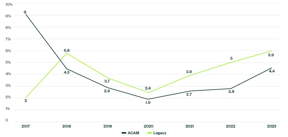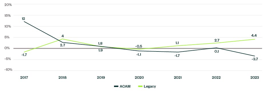 Since the first ACAM election took effect in 2017, companies that elected ACAM-I or ACAM-II, have shown revenue growth rates that are 1% to 2.5% less than companies on legacy rate-of-return.