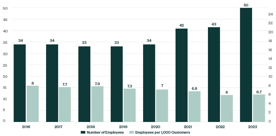 The graphic below overlays the median number of employees with the number of employees per 1,000 customers throughout the past seven years. As this number dropped from eight employees per 1,000 customers in 2016 to 6.7 in 2023, the data appears to support that companies realized some efficiencies in serving customers over the past several years.