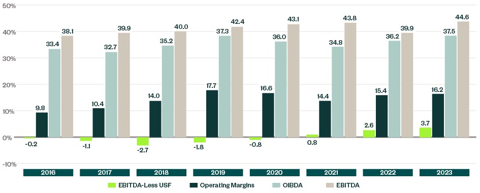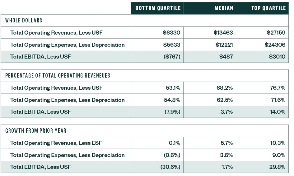 Over 5.3% growth in total operating margins, fueled by a 7.9% growth in broadband internet revenues, bolstered profitability while maintaining 2022 levels of federal USF. Specific to USF, interest continues to be high in evaluating a company’s profitability excluding federal and state universal service support — EBITDA-less USF or controllable margins.