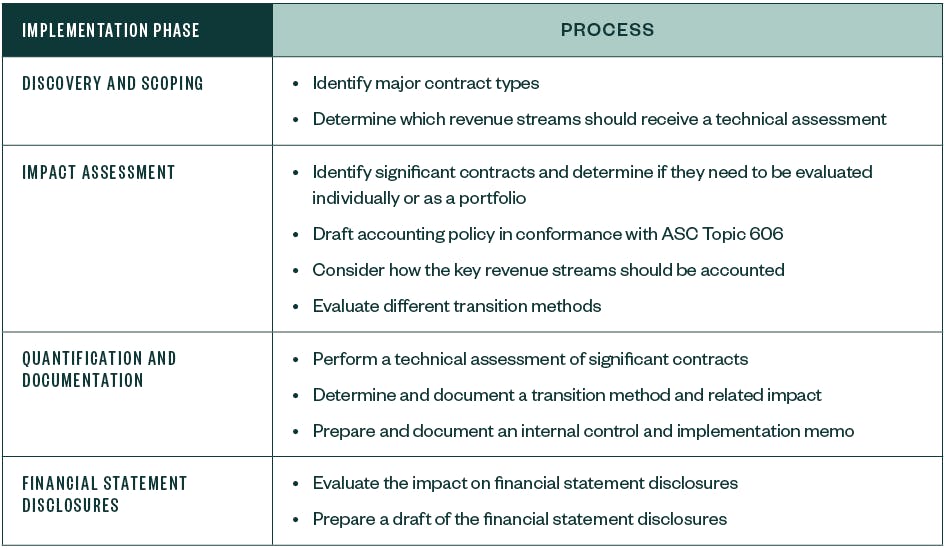 There are four phases of implementation that professional services companies are likely to find helpful when adopting ASC Topic 606 for the first time.