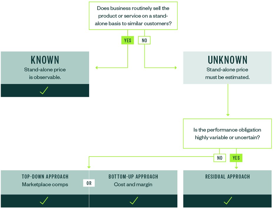 However, if a particular performance obligation isn’t sold on a standalone basis or if the standalone selling price isn’t directly observable, the standalone selling price will need to be estimated. If pricing for the performance obligation isn’t highly variable or uncertain, the standard states the following two techniques may be used to estimate the standalone selling price: