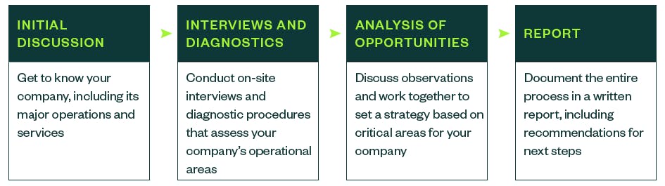 Utilizing tools we developed, we evaluate the operational processes you specify and deliver improvement recommendations and a comprehensive action plan, generally within one to two weeks. This report offers an objective assessment of your organization’s operations in designated areas and includes actionable recommendations for enhancements and improvements.