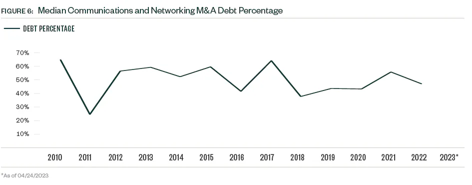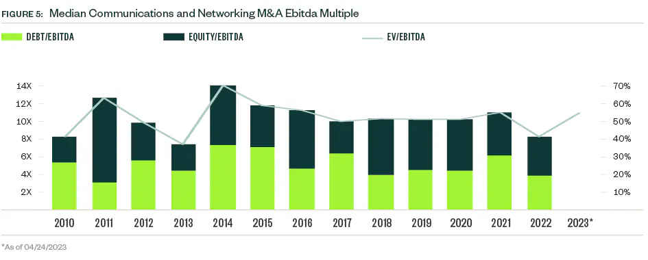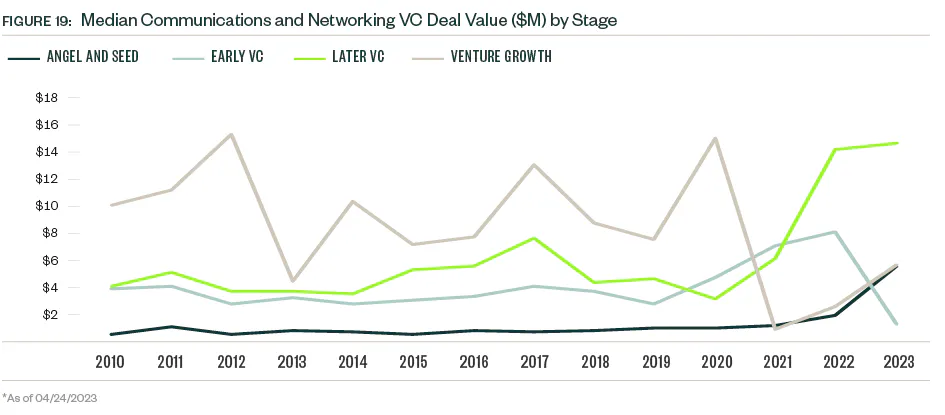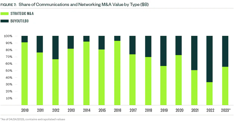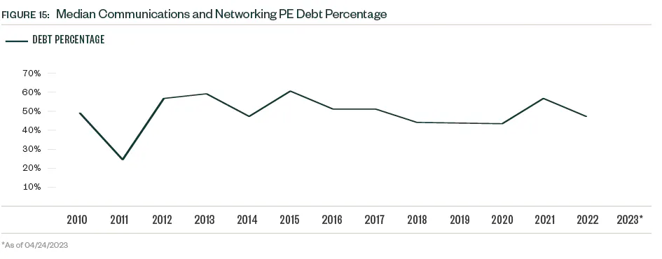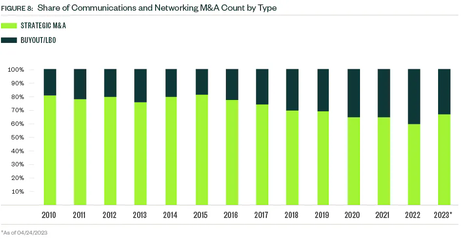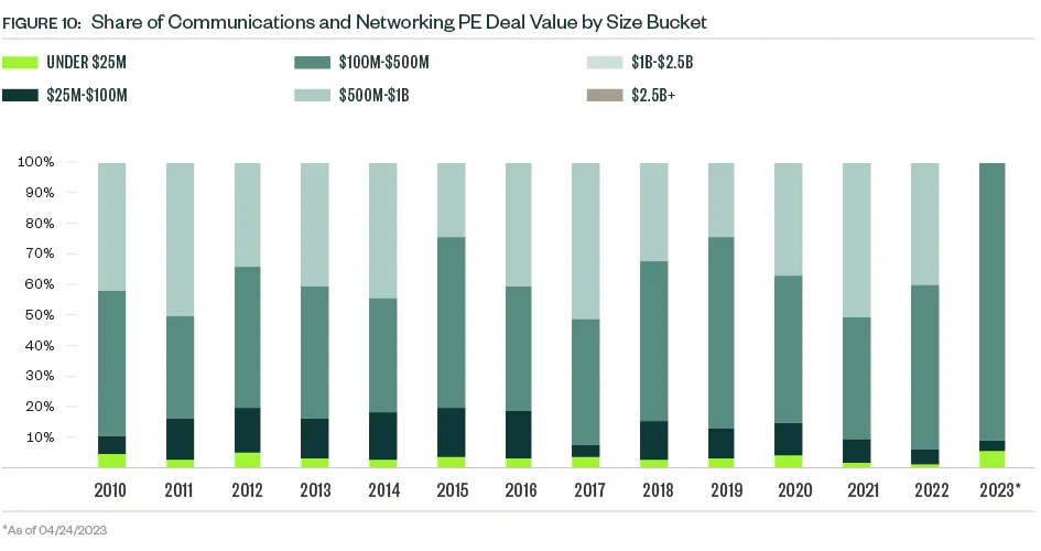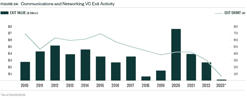 The PE exit environment in the communications and networking industry can be cyclic with several peak and trough years since 2010. A precipitous drop in exit value occurred in 2022, common across industries. So far in 2023, just nine PE exits closed — a number more reminiscent of the small VC presence in the space. Market volatility continues to weigh on valuations, which creates a larger entry pipeline for PE portfolio companies but compounds difficulties down the line for those seeking exits.