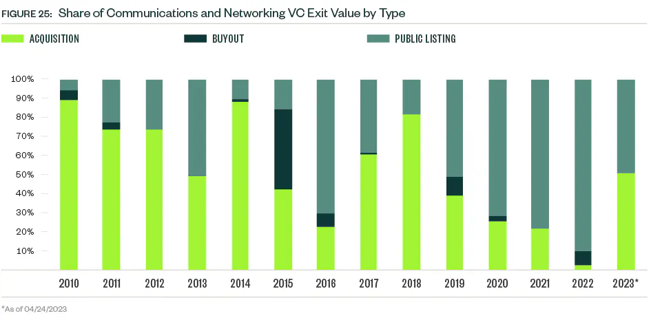 VC exit activity in the space had a record high in 2020 and declined each year since then. Activity YTD reflects continued caution regarding exits, with just one public listing, one buyout, and four acquisitions completed.