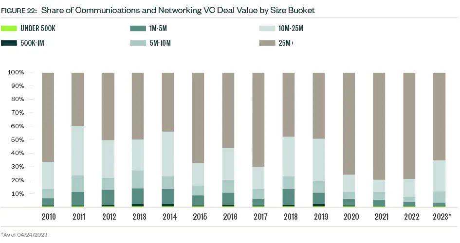 So far in 2023, sample sizes are low, and median deal sizes experienced a mixed bag of changes. The median deal size for early stage VC dropped, while that of the late-stage VC group plateaued. Late-stage deals dominate the industry’s presence in venture, representing nearly half of the total deal count and more than three-quarters of total deal value YTD.