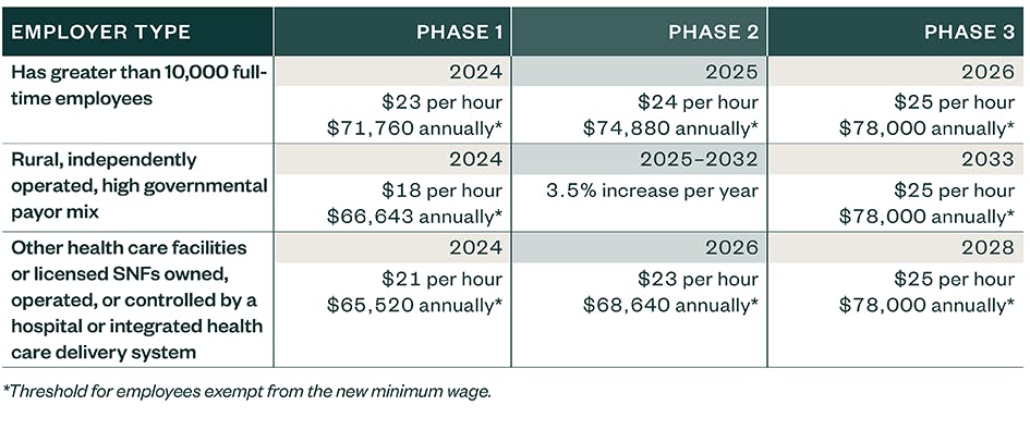 Rural and independent hospitals with a high or elevated governmental payor mix, or entities operated by counties with less than 250,000 residents as of Jan. 1, 2023, will see a longer process. These employees will have a new minimum wage starting at $18 per hour in 2024. Every year, this minimum wage will increase by 3.5% yearly until it reaches $25 per hour in 2033. This applies to psychology clinics, specialty care clinics, and dialysis clinics.