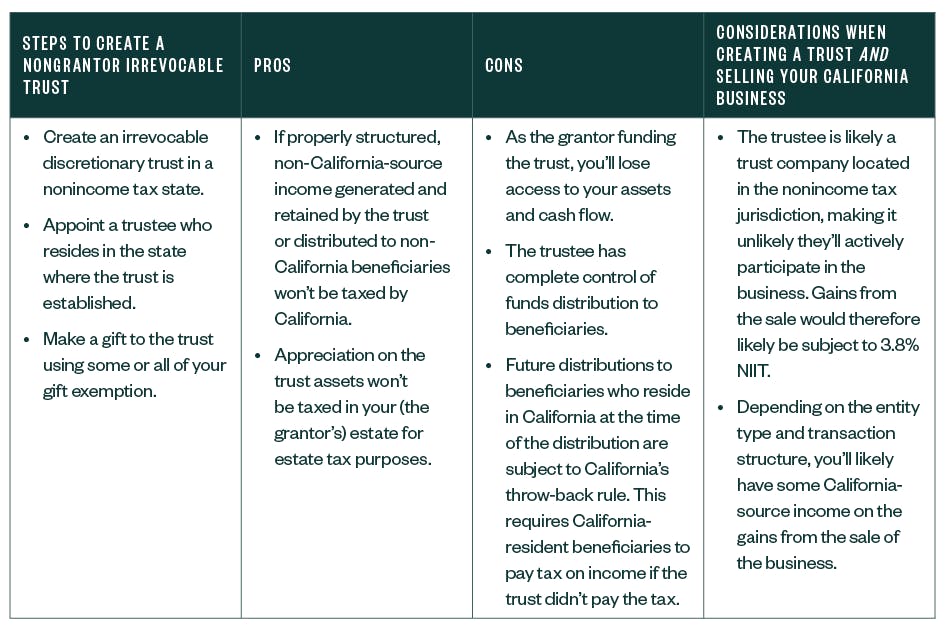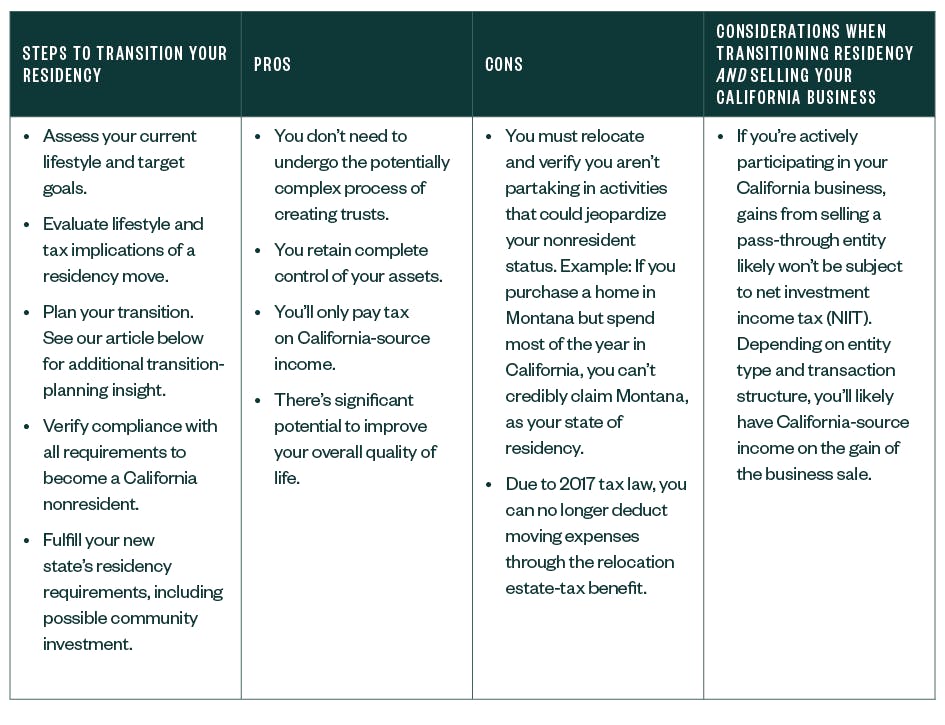 If you’re considering a residency transition for financial reasons, there are many options available. These range from a complete out-of-state move to transferring assets to a non-California trust.