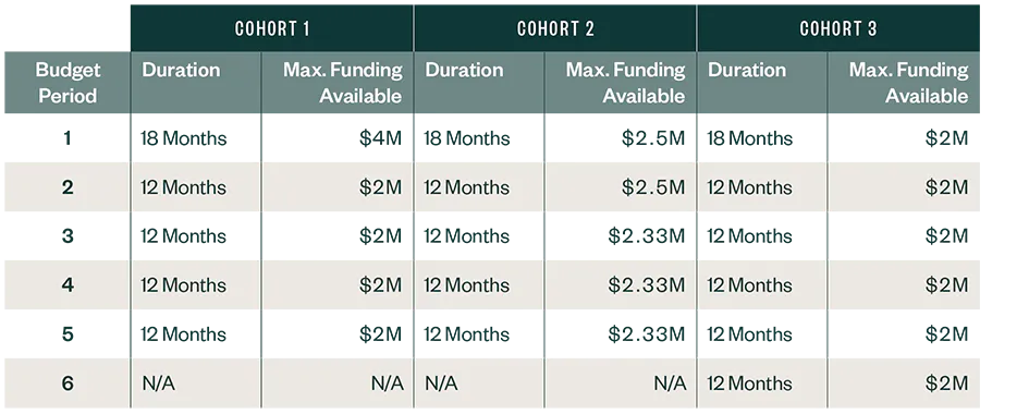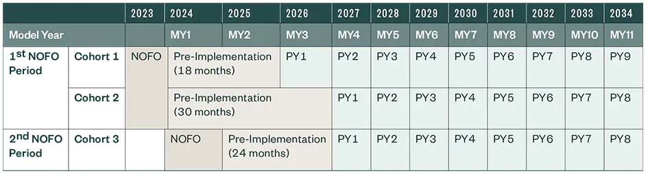 The cooperative agreement funding payments will be distributed over the course of five and a half to six years, depending on the cohort the state joins. In other words, CMS will provide initial funding through 2028 or 2029. The table below shows the cadence of these funding distributions.