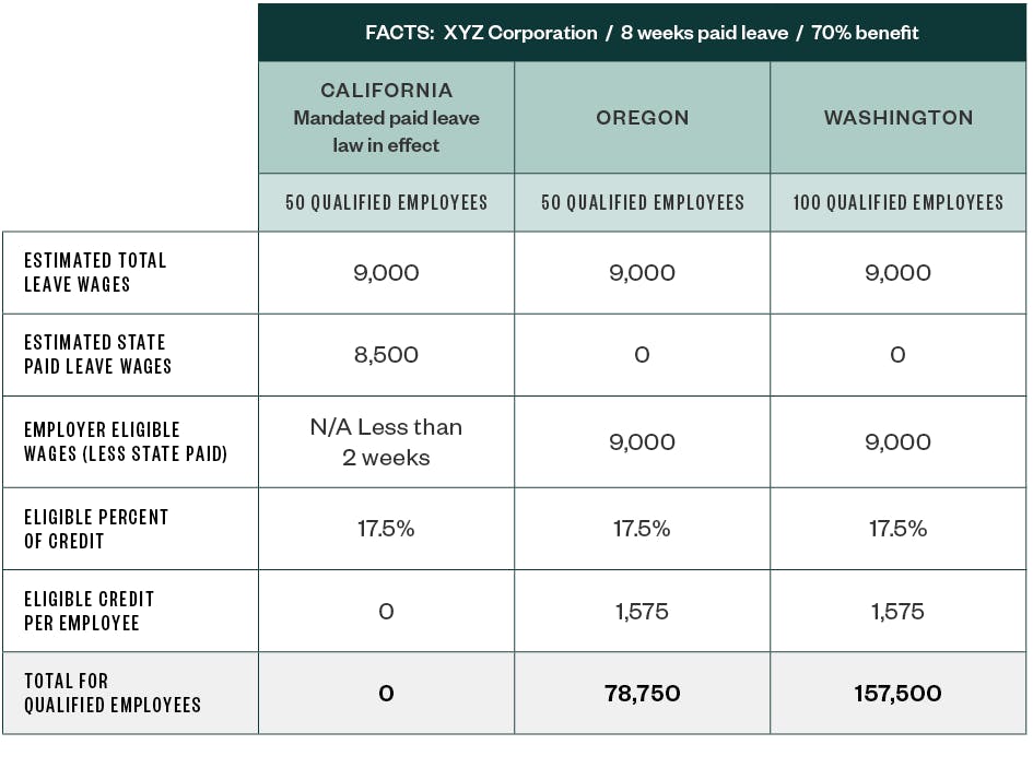This process can be complicated and may vary for each employee and each state they’re performing services in. Below is a high-level example of how this credit can be calculated in states with and without mandated paid leave laws.