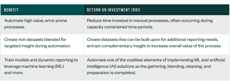 Data analysts can spend a significant amount of time on data collection, data cleaning, and data organization. Data automation can eliminate manual processes — downloading, integrating, and organizing data from various systems — for significant time savings.