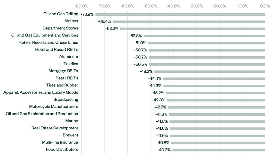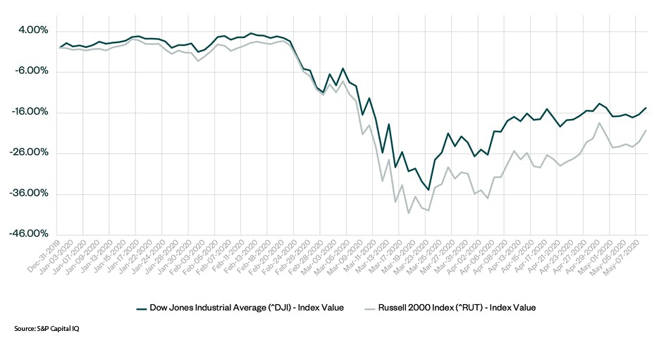 Since the end of 2019 through May 8, 2020, the Dow Jones Industrial Average and the Russell 2000 indices are down 14.7% and 20.3%, respectively, primarily as a result of the pandemic.
