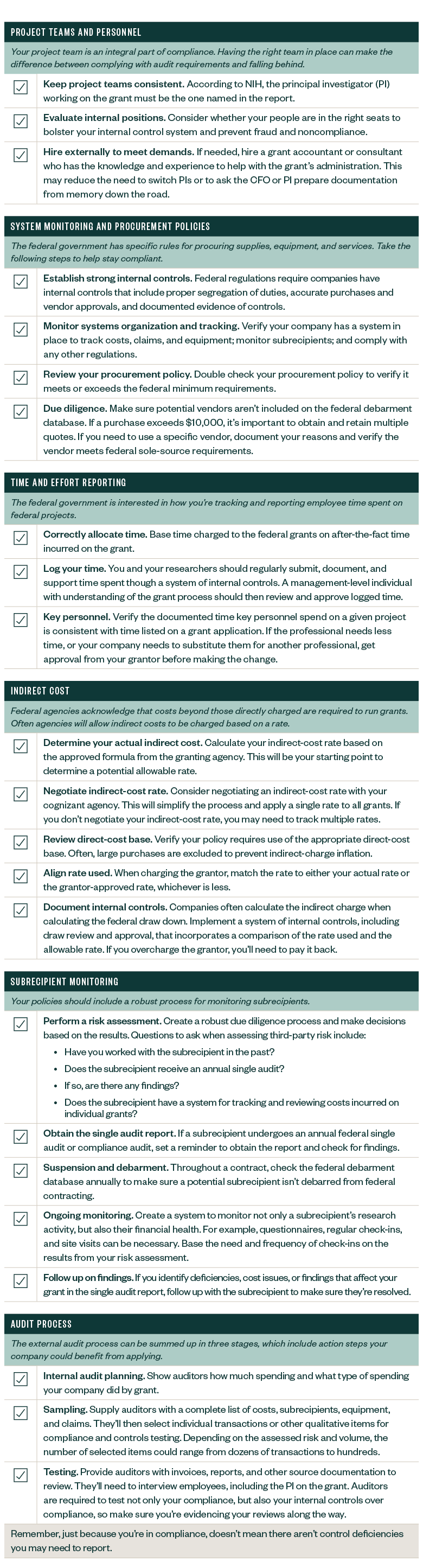 Agencies’ audit requirements can differ. However, if a company spends over $750,000 of grant funding in a given year under an individual federal agency, it will likely need an audit of compliance and internal control over compliance for that year. These audits are typically due within nine months of year-end.