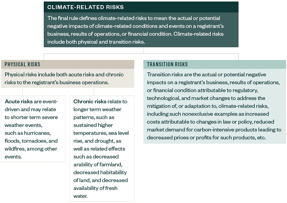 - Climate-related risks include physical, acute or chronic, and transition risks