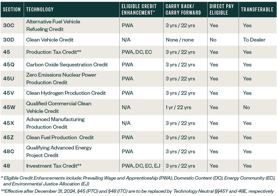 The Inflation Reduction Act reauthorized and expanded several renewable energy and green manufacturing credits and made eleven of those credits transferrable.