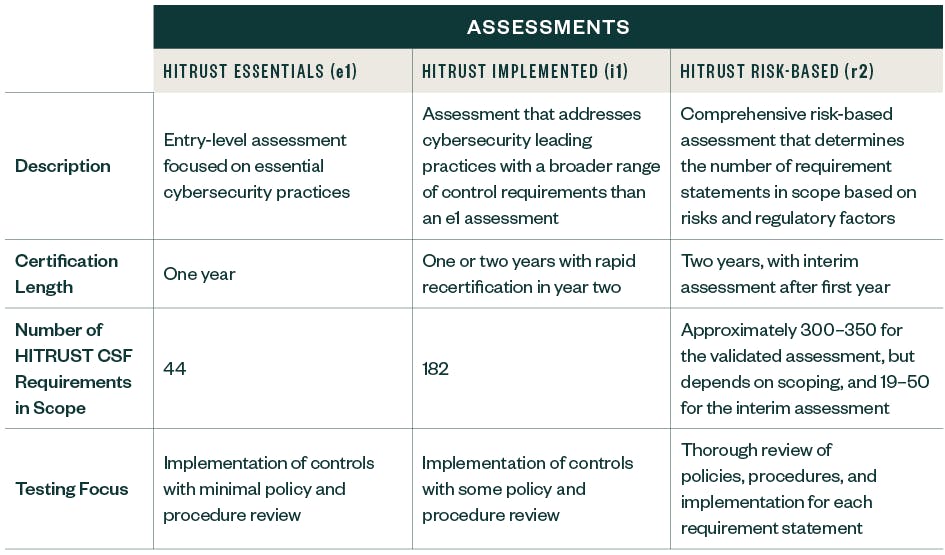 The following is a cursory explanation of each assessment type. For more details on each assessment, visit HITRUST assurance advisories.