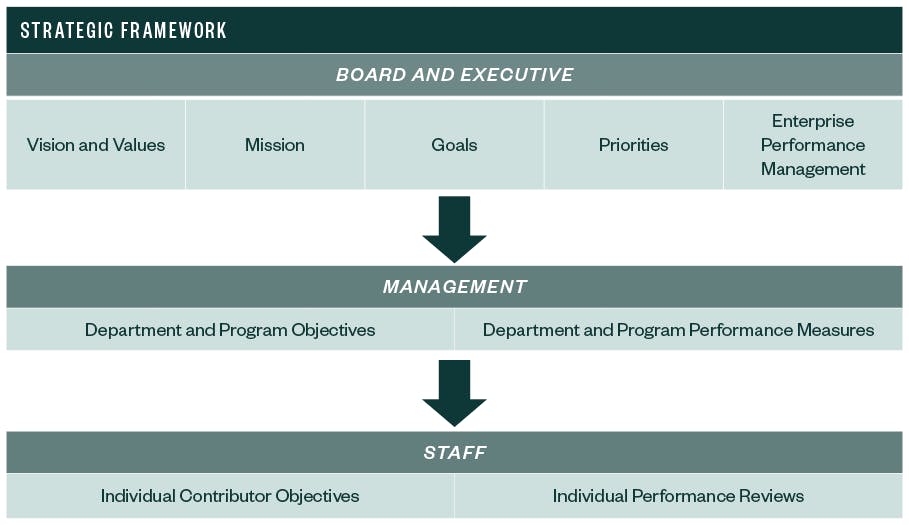 When thinking of what to measure, it’s good to again revisit the strategic plan. You want the higher level, board-driven priorities at the top, the program-level objectives set by managers, and the individual contributor outputs to all tie back to the strategic plan. You can even include performance measures and other reporting you’re already doing in your budget so you can see how it all connects.