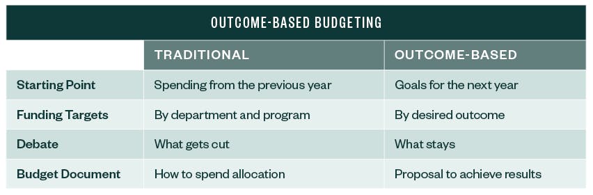 Outcome-based budgeting takes a different approach. You start with the goals set out in your strategic planning document and work from there to figure out what resources are needed to achieve these goals.