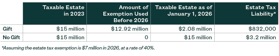 The estate tax savings realized by utilizing the exemption now is demonstrated in the table below. If we assume an estate is valued at $15 million, the full 2023 exemption was used to gift $12.92 million, and there’s no growth on the remaining assets, then the taxable estate in 2026 would be valued around $2.08 million.