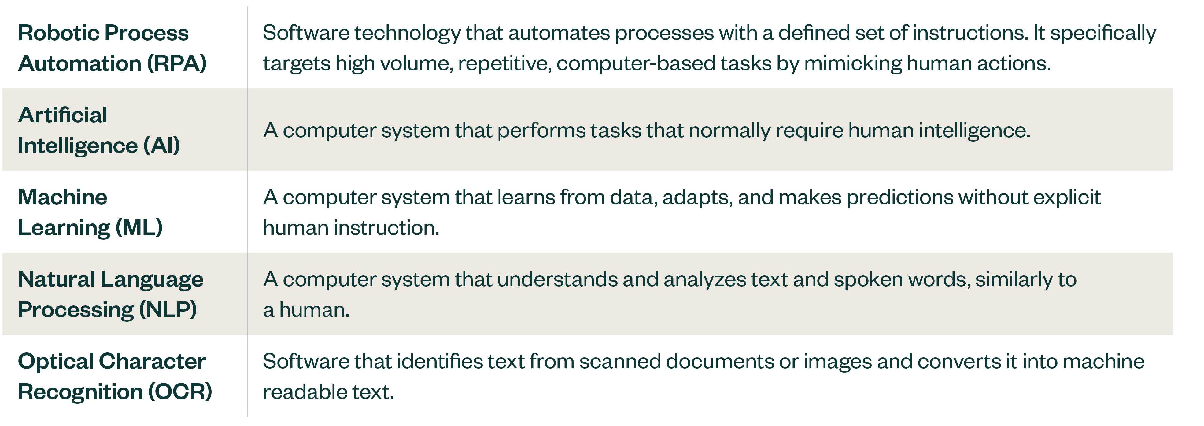 One area AI can make an impact within an organization is through intelligent automation processes. Intelligent automation can be applied to highly manual business processes to help: