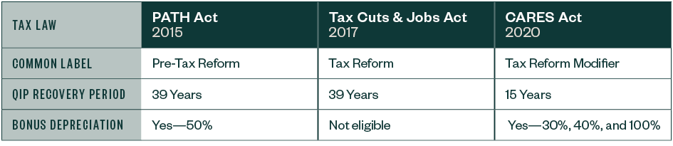 Qualified improvement properties (QIPs), which encompass many improvements made to existing commercial buildings, are now depreciated over 15 years and are eligible for bonus depreciation due to the Coronavirus Aid, Relief, and Economic Security (CARES) Act.