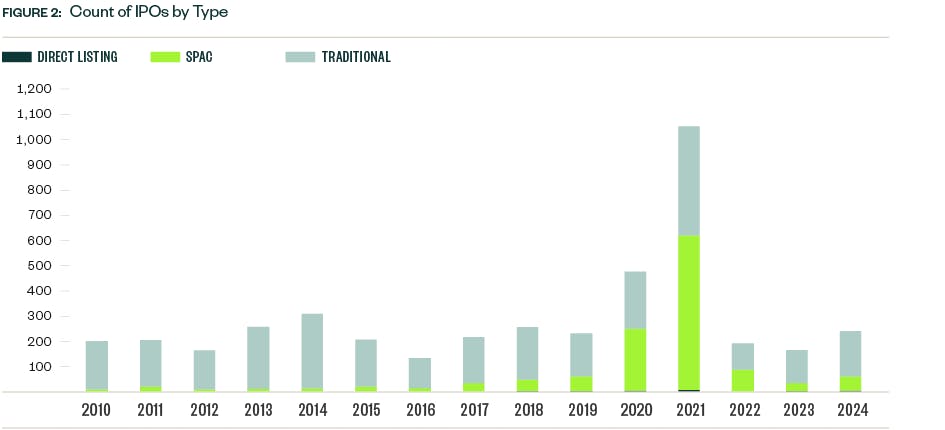 Historical data provides valuable context: 2022–2023's extremely low activity makes 2024's recovery appear more robust than it may be, while 2020-2021's SPAC-driven surge represents an unsustainable outlier rather than a realistic benchmark — only accounting for 57 of all 2024 IPOs but possibly reflecting a sustainable place in the capital markets for this method of going public.