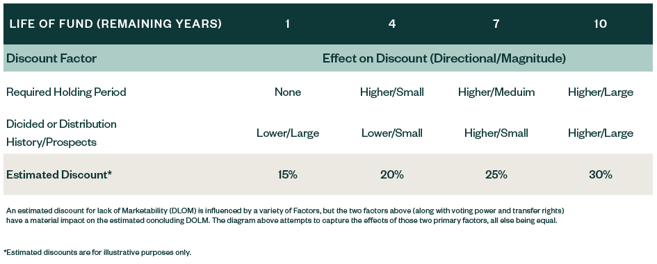 Valuation services will look at certain characteristics that may influence the magnitude of the DLOM such as fund term, expected volatility, and the relevant rights and preferences detailed in the fund agreement. All else equal, the more volatile the potential returns of the fund and the longer left until the end of the fund life, the higher the potential DLOM applicable.