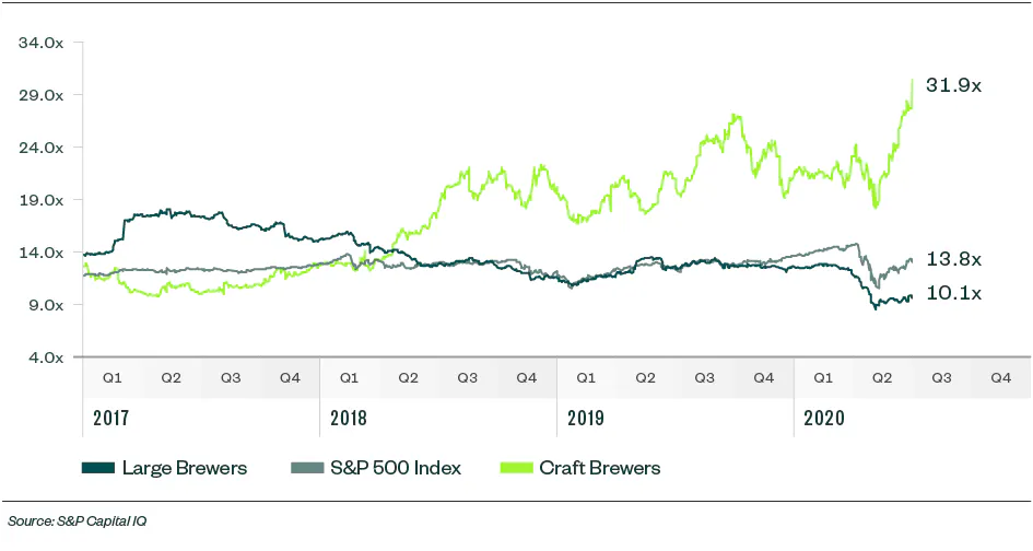 Large brewers are generally trading below the S&P 500 index, reaching a trailing earnings before interest, taxes, depreciation, and amortization (EBITDA) multiple of 10.1 times, compared to a multiple of 13.8 times, while publicly traded craft brewers are at a multiple of 31.9 times. The few remaining publicly traded craft brewers still experienced higher valuation multiples due to their substantial anticipated growth, which is driven by strong resonance with younger consumers.