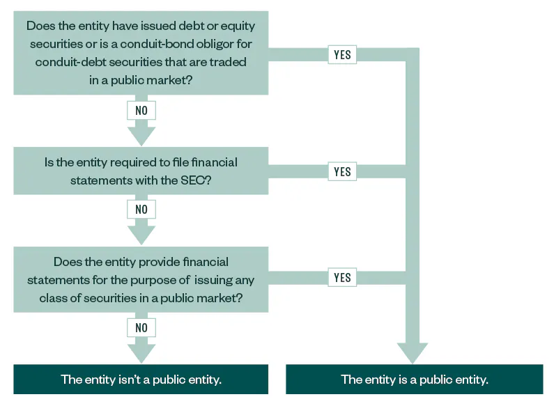 The ASC includes a couple definitions of a public entity. However, for this article, we’ll defer to only one definition, which classifies a business entity or NFP as a public entity if it meets a series of conditions, as shown in the below flow chart.