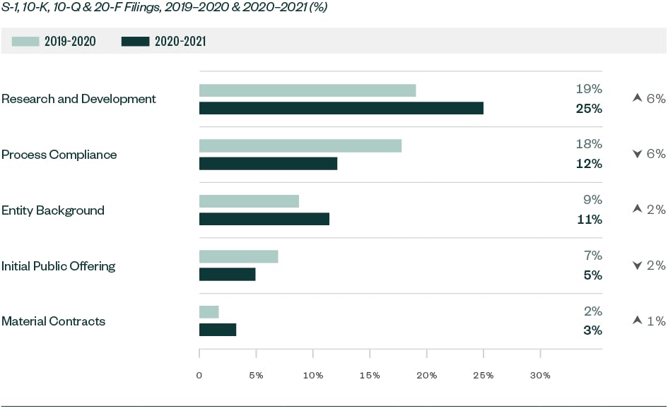 Similar to previous years, research and development (R&D) made up the largest area of SEC focus in 2020–2021, with a strong emphasis on clinical trials and developmental products and pipelines. Focus on entity-related disclosures grew, with many companies asked to clearly disclose the impact of COVID-19 on their operations.
