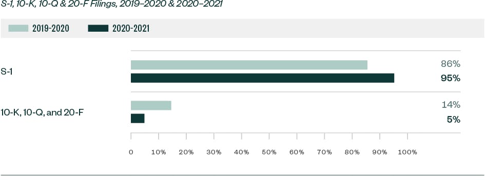 S-1 filings continued to lead in relation to SEC scrutiny. Of the total 1,497 comments analyzed in the study, roughly 95% — or 1,424 comments — were directed at Form S-1. This represented a substantial increase from a share of 86% in 2019–2020.