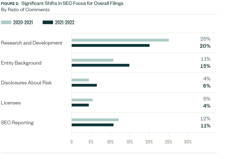 As in previous years, R&D continued as the largest area of SEC focus in 2021–2022, with a strong emphasis on disclosures surrounding companies’ clinical trials and in-product development.