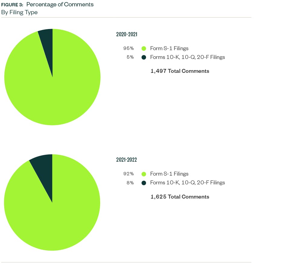 Similar to prior years, Form S-1 filings continued to lead in relation to SEC scrutiny. Of the 1,625 total comments analyzed in the study, roughly 92% — or 1,487 comments — were directed at Form S-1 filings. This is a slight decrease from a share of 95% in 2020–2021.