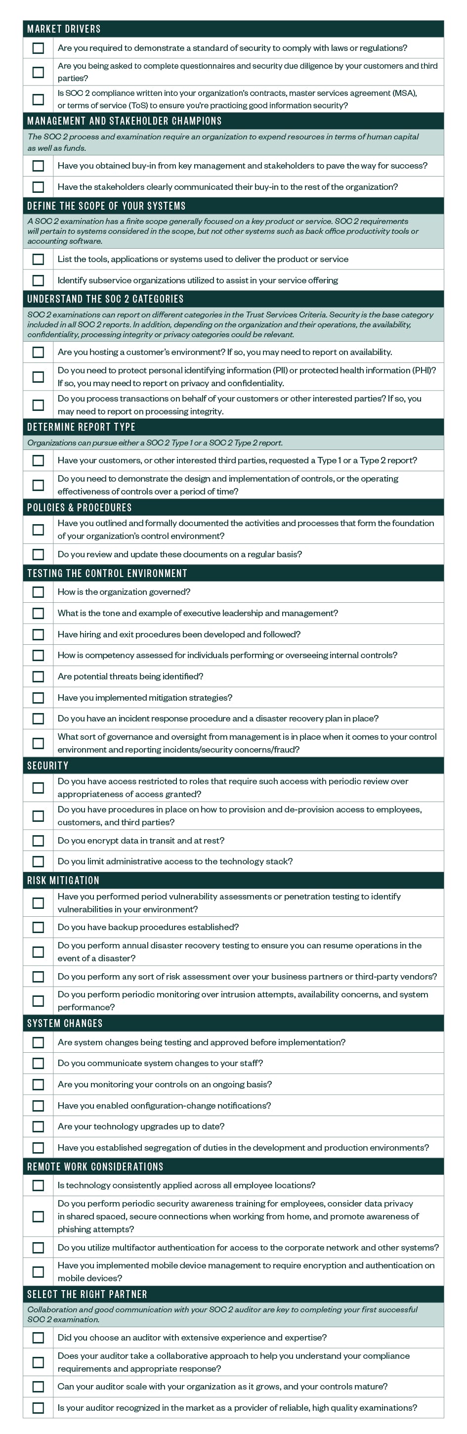 - Checklist highlights. Use our checklist to define the scope of your systems, determine the proper report type, test your control environment, and outline your risk mitigation.