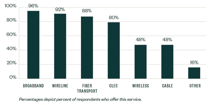 Respondents were instructed to select all services that apply. The majority offer broadband, wireline, and fiber transport as their top three.