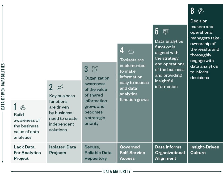 Organizations at the beginning of the process and lacking insight into their data can start by building awareness of the business value of data analytics. They should be able to articulate the importance of data and what questions around their business they’re seeking to answer.